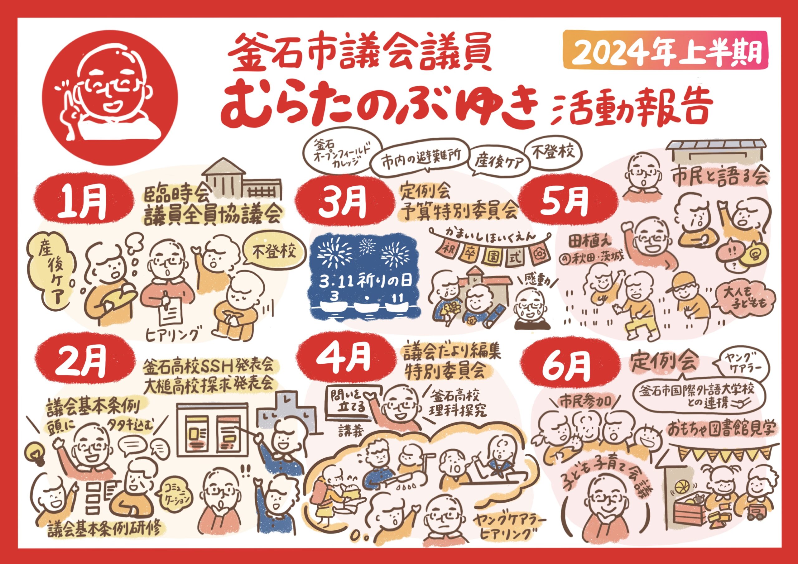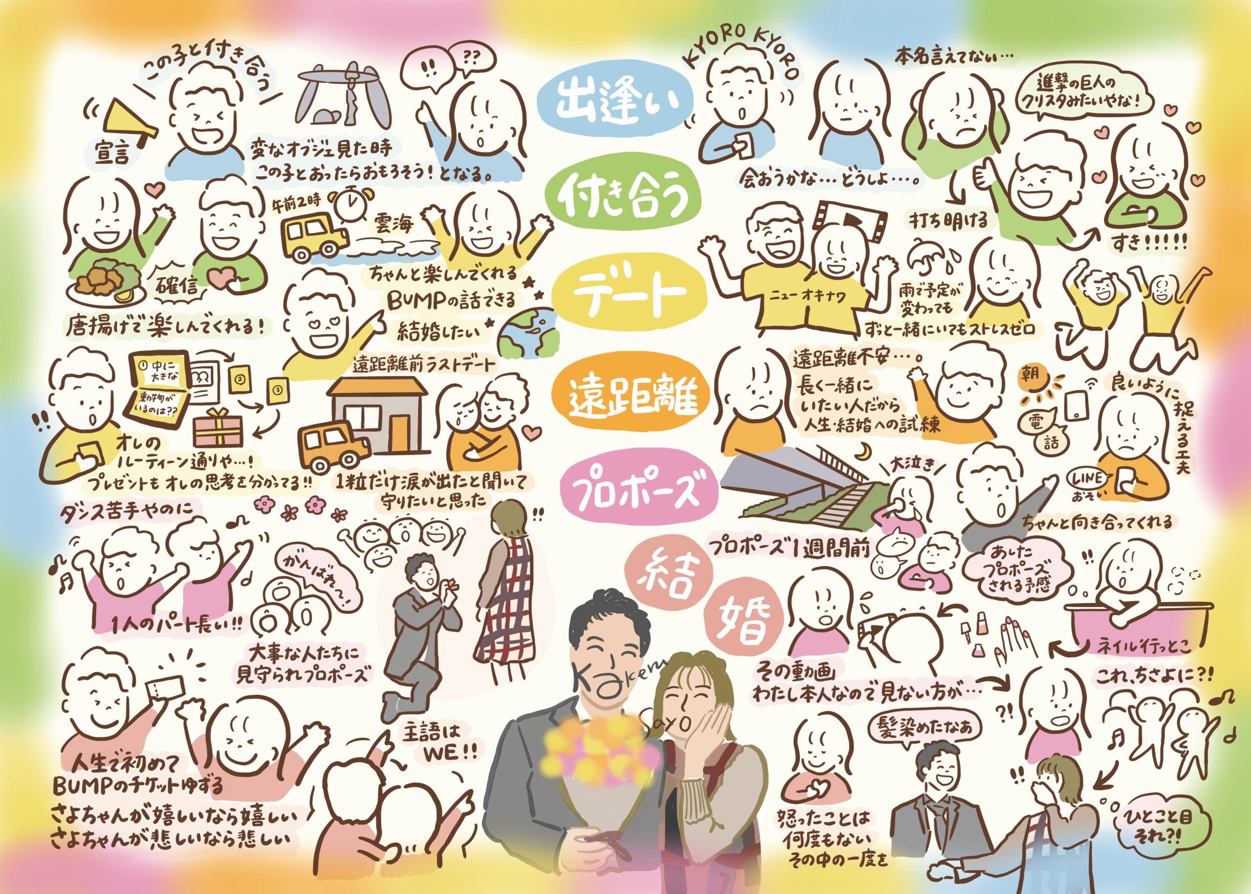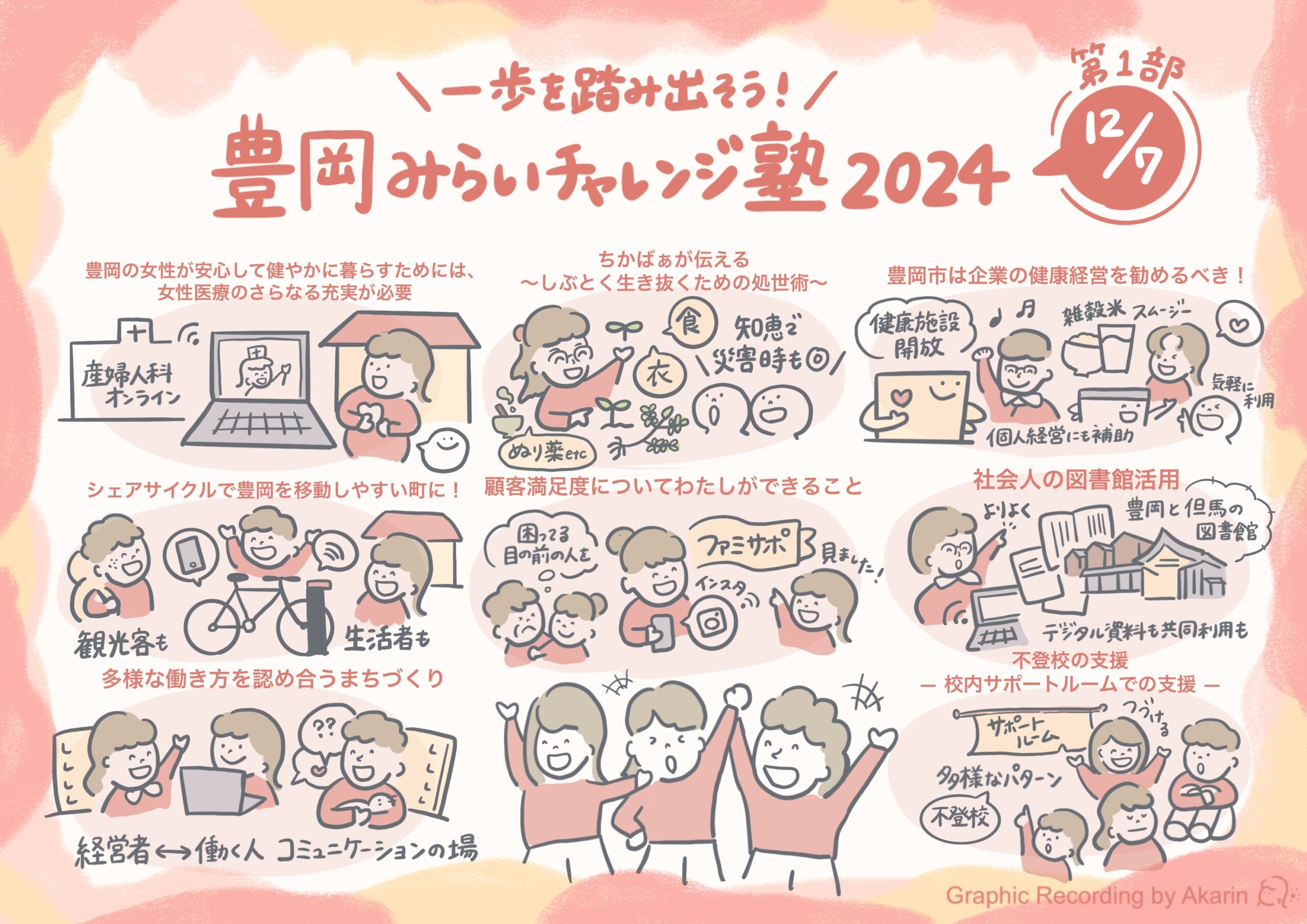 思わずほっこりするような、大きくてかわいらしいイラストでまとめます。伸び伸びとした見やすいグラレコを描いています。