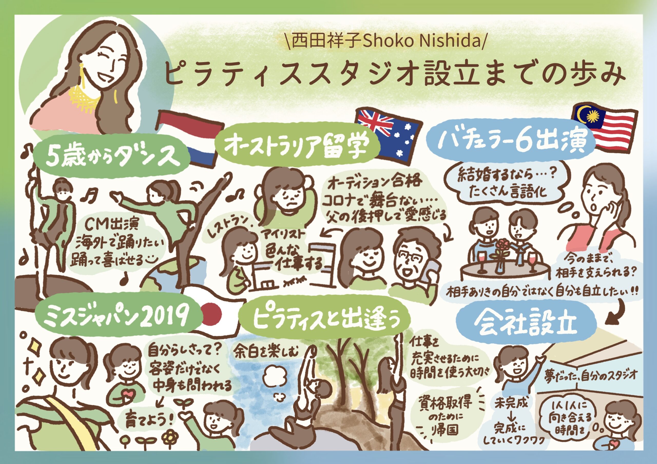 現在は、IT企業の会社員・都内中高にて非常勤講師・グラフィックレコーダー・イラストレーター・ブロガー・たまにヨガインストラクターと、6足のわらじ生活をしています。関西出身で、いまだに関西弁が抜けません。